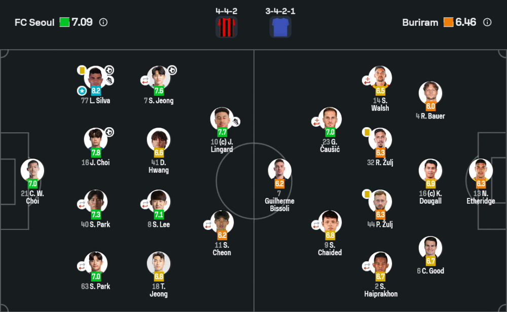 Lucas Silva (FC Seoul) — ตัวทีเด็ดฝั่งซ้ายที่ทำให้เกมรับบุรีรัมย์ปั่นป่วนตลอดเวลา สร้างสรรค์โอกาสติดต่อกันทั้งครึ่งแรกและครึ่งหลัง จบด้วย 1 ประตู 1 แอสซิสต์ เรตติ้ง 8.2 สมศักดิ์ศรีแมนออฟเดอะแมตช์ ทั้งคมและขยันไล่เพรสจนทีมยึดจังหวะเกมไว้หมด