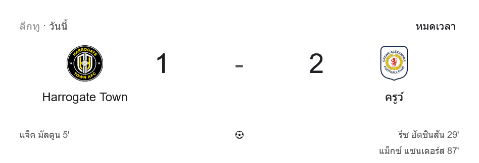 บ้านกีฬา พามาย้อนเกมดุเดือดในศึก อีเอฟแอลลีกทู เมื่อ ฮาโรเกต ทาวน์ เปิดบ้านรับการมาเยือนของ ครูว์ อเล็กซานดร้า เกมนี้เต็มไปด้วยจังหวะเข้าทำที่กดดันตลอดทั้งสองฝั่ง และจบลงด้วยชัยชนะของทีมเยือนที่เฉียบคมกว่า คว้าสามแต้มกลับบ้านด้วยสกอร์ 2-1 ซึ่งผลนี้ถือเป็นการกระตุ้นอันดับบนตารางให้ขยับตาม บ้านผลบอล แบบเข้มข้น