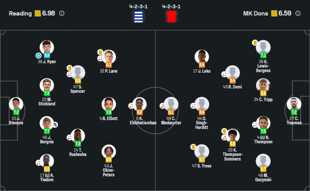 เร้ดดิ้งเปิดฉากด้วย 4-2-3-1 เดินเกมกดดันสูง ครองบอลไหลลื่นจากคู่กลาง เบน เอลเลียต กับ ทิโมธี รูเชชา แล้วฉีกออกปีกให้ จอห์น ไรอัน ข่มแนวรับทีมเยือนตลอด แต่จังหวะสุดท้ายยังไม่คมพอ ทางฝั่งเอ็มเค ดอนส์รับแน่นใน 4-2-3-1 เช่นกัน ป้องกันพื้นที่กลางได้ดีโดย นาธาน ธอมป์สัน คุมจังหวะ ไม่มีสกอร์ จบครึ่งแรก 0-0