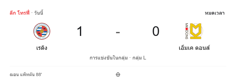 บ้านกีฬา พาเกาะทุกจังหวะแบบ ผลบอลสด ศึก จอห์นสโตนส์ เพนท์โทรฟี่ กลุ่ม L ที่มาเดน สเตเดียม เกมอึดอัดตลอด 90 นาที ก่อนที่เร้ดดิ้งจะได้ฮีโร่หน้าใหม่อย่าง ฌอน แพ็ตตัน ซัดประตูโคตรสำคัญนาที 88 พาทีมเชือด มิลตัน คียนส์ ดอนส์ 1-0 เก็บสามแต้มเต็มสุดล้ำค่า