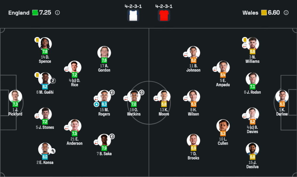 Morgan Rogers คือฮีโร่ของเกมนี้ ยิงเปิดหัวในนาทีที่ 3 และสร้างความปั่นป่วนให้แนวรับเวลส์อย่างต่อเนื่อง ได้คะแนน 8.3 จาก Sofascore มีส่วนร่วมกับเกมรุกเกือบทุกจังหวะ เป็นตัวจุดประกายที่พาอังกฤษเก็บชัยแบบสบายๆ