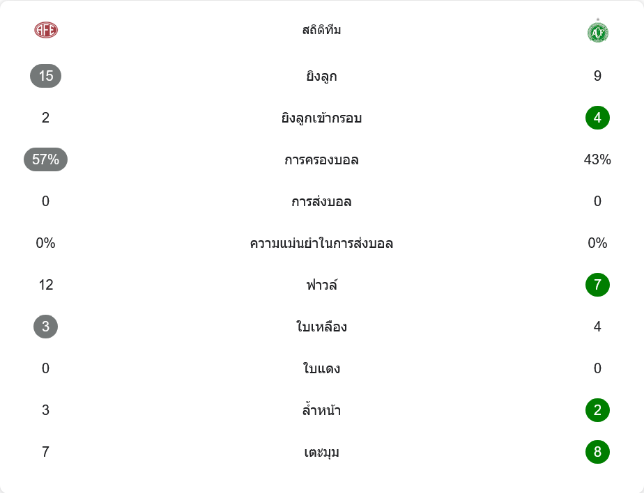 เฟอร์โรเวียเรีย มีเปอร์เซ็นต์ครองบอลมากกว่า 57% และยิงทั้งหมด 15 ครั้ง เข้ากรอบเพียง 2 ครั้ง ขณะที่ ชาเปโคเอนเซ่ แม้จะครองบอลแค่ 43% แต่ยิง 9 ครั้ง เข้ากรอบถึง 4 ครั้ง แสดงถึงความคมในจังหวะสุดท้าย ฝั่งเจ้าบ้านฟาวล์ไป 12 ครั้ง ได้ใบเหลือง 3 ใบ ส่วนทีมเยือนได้ใบเหลือง 4 ใบ เตะมุม 8 ครั้ง และมีจังหวะสวนกลับที่เฉียบคมกว่าตลอดทั้งเกม