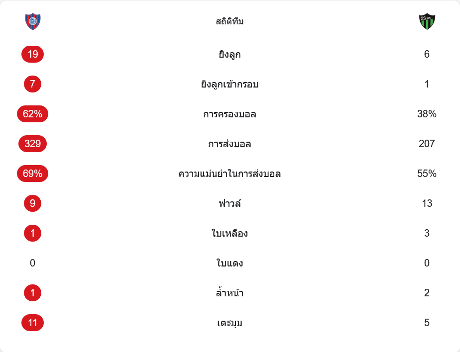 ตลอดเกมเจ้าบ้าน ซาน ลอเรนโซ่ ครองบอลมากถึง 62% มีจังหวะยิงทั้งหมด 19 ครั้ง เข้ากรอบ 7 ครั้ง ขณะที่ทีมเยือนมีโอกาสเพียง 6 ครั้ง เข้ากรอบเพียงครั้งเดียวแต่เป็นประตูชัยสำคัญ การส่งบอลของเจ้าบ้านมากถึง 329 ครั้ง ความแม่นยำ 69% ส่วนทีมเยือนส่งบอล 207 ครั้ง ความแม่นยำ 55% ในแง่ความเข้มข้น ซาน ลอเรนโซ่ ดูดีกว่าแทบทุกด้าน แต่ ซาน มาร์ติน เล่นแบบเฉียบขาดเมื่อถึงเวลาสำคัญ