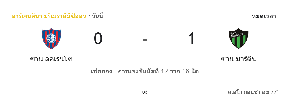 ศึกฟุตบอล อาร์เจนติน่า พรีเมียร์ดิวิชั่น คืนนี้เดือดระอุที่สนามเหย้าของ ซาน ลอเรนโซ่ เมื่อพวกเขาเปิดบ้านพ่ายแบบสุดช็อกให้กับ ซาน มาร์ติน ซานฮวน 0-1 โดยได้ประตูชัยสำคัญในนาทีที่ 77 จาก ดิเอโก้ กอนซาเลซ ส่งผลให้รูปเกมที่เจ้าถิ่นครองบอลและยิงมากกว่ากลับไม่สามารถคว้าสามแต้มได้ ขณะที่ฝั่งทีมเยือนเล่นเกมสวนกลับเฉียบคม และมีผู้รักษาประตูโชว์ฟอร์มโหดสุดๆ งานนี้แฟนบอลที่เปิดเช็ก ผลบอลสด ต่างพูดเป็นเสียงเดียวกันว่า “ของจริง!”
