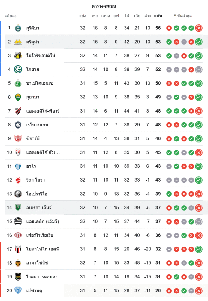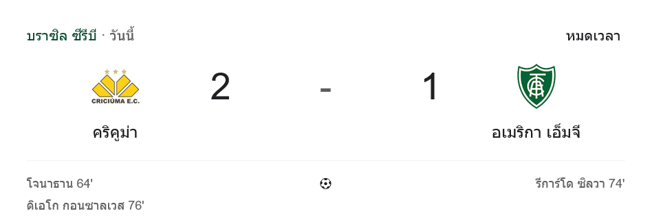 จาก : ผลบอลสด คัมปิโอนาโต บราซิเลียโร ซีรีบี ระหว่าง คริคูม่า 2-1 อเมริกา เอ็มจี วันนี้ 13/10/68 – บ้านกีฬา