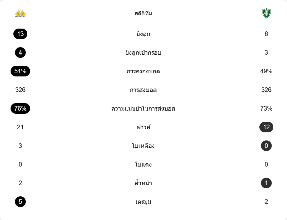 - 🟨 ใบเหลืองฝั่งคริคูม่า: João Carlos (41’), Marcinho (67’), J. Robert (72’)