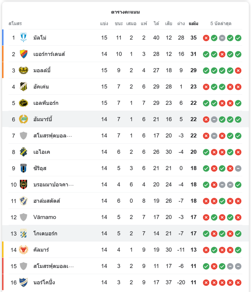 - มัลโม่: แข่ง 15 นัด ชนะ 11 นัด เสมอ 2 นัด แพ้ 2 นัด (35 คะแนน)