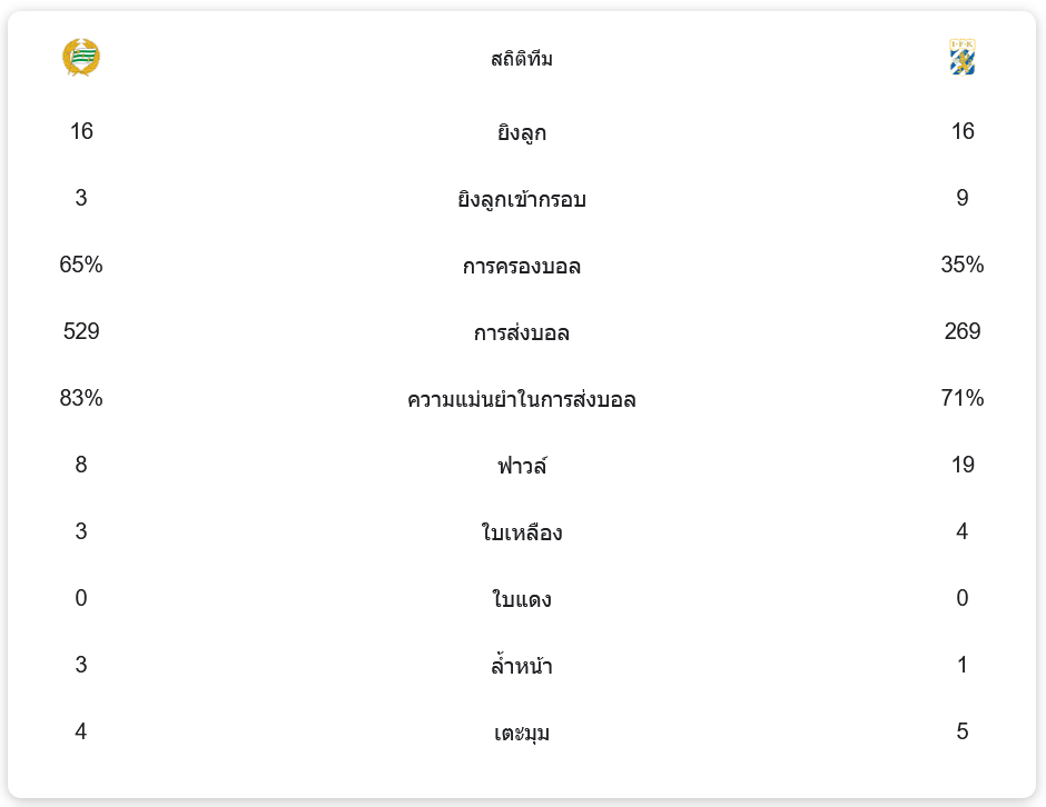ฮัมมาร์บี้ ครองบอลถึง 65% ยิงประตูทั้งหมด 16 ครั้ง โดยเข้ากรอบ 3 ครั้ง พวกเขาส่งบอลทั้งหมด 529 ครั้ง ด้วยความแม่นยำในการส่งบอลอยู่ที่ 83% ฮัมมาร์บี้ ทำฟาวล์ทั้งหมด 8 ครั้ง ได้รับใบเหลือง 3 ใบ ไม่มีใบแดง ลูกล้ำหน้า 3 ครั้ง และได้ลูกเตะมุม 4 ครั้ง