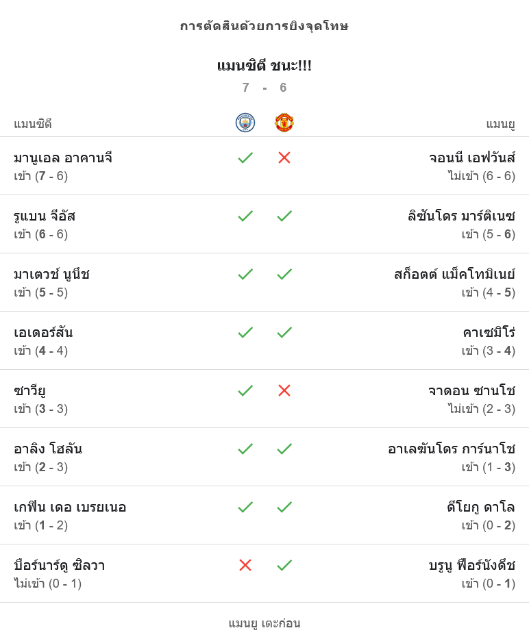 - มาเอนูล อากานจี (แมนเชสเตอร์ ซิตี้) ยิงเข้า (7-6)