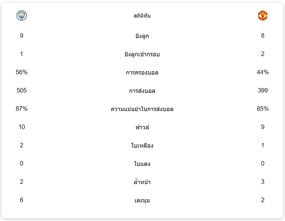 ด้านทีมแมนเชสเตอร์ ยูไนเต็ดมีการยิงทั้งหมด 8 ครั้ง ยิงเข้ากรอบ 2 ครั้ง ครองบอลได้ 44% การทำฟาวล์ทั้งหมด 9 ครั้ง ได้รับใบเหลือง 1 ใบ ไม่มีใบแดง ได้เตะมุม 2 ครั้ง และล้ำหน้า 3 ครั้ง