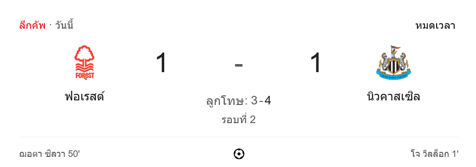 เมื่อเข้าสู่การดวลจุดโทษ ทั้งสองทีมต่างแสดงความมั่นใจในการยิง แต่ในที่สุด นิวคาสเซิ่ล ยูไนเต็ด สามารถยิงได้แม่นยำกว่า เอาชนะฟอเรสต์ไป 4-3 ส่งผลให้ทีมเยือนผ่านเข้าสู่รอบต่อไปของ อีเอฟแอลคัพ ได้สำเร็จ