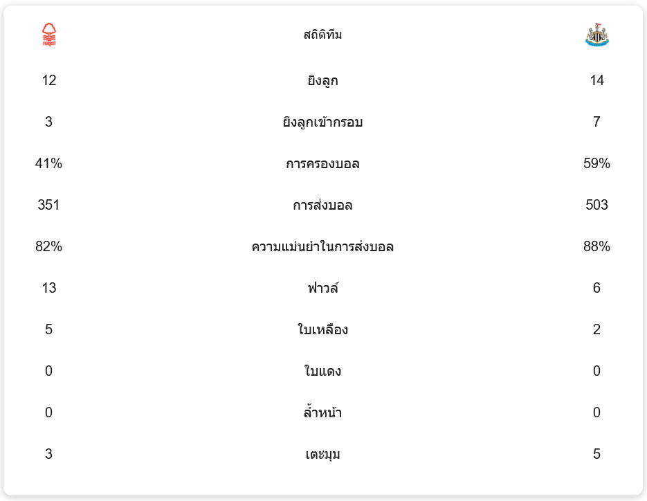 นิวคาสเซิ่ล ยูไนเต็ด ครองบอลได้มากกว่า โดยมีอัตราการครองบอล 59% เทียบกับฟอเรสต์ที่มีเพียง 41% นอกจากนี้ นิวคาสเซิ่ลยังมีโอกาสยิงมากกว่าด้วยจำนวนการยิงทั้งหมด 14 ครั้ง โดยยิงเข้ากรอบ 7 ครั้ง ในขณะที่ฟอเรสต์มีการยิง 12 ครั้ง และยิงเข้ากรอบ 3 ครั้ง การส่งบอลของนิวคาสเซิ่ลมีความแม่นยำสูงถึง 88% จากการส่งบอลทั้งหมด 503 ครั้ง ส่วนฟอเรสต์มีความแม่นยำ 82% จากการส่งบอล 351 ครั้ง ฟอเรสต์ทำฟาวล์ถึง 13 ครั้งและได้รับใบเหลือง 5 ใบ ขณะที่นิวคาสเซิ่ลทำฟาวล์เพียง 6 ครั้งและได้รับใบเหลือง 2 ใบ