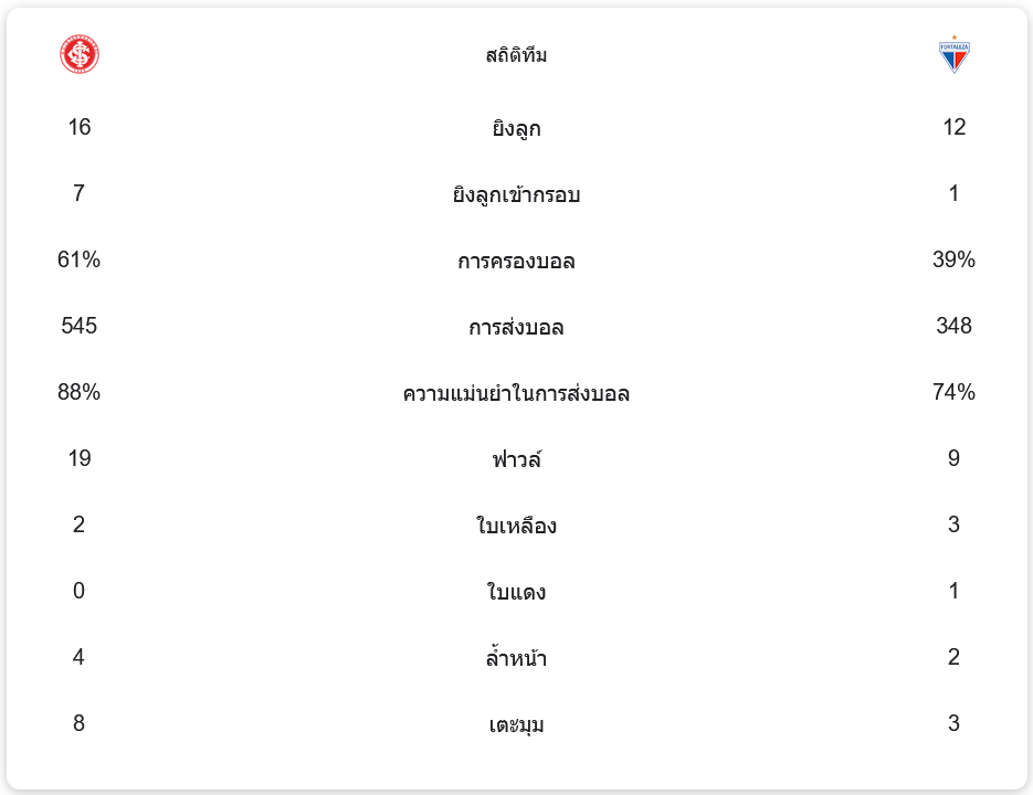 อินเตอร์นาซิอองนาลครองบอลได้ถึง 61% และมีโอกาสยิงทั้งหมด 16 ครั้ง เข้ากรอบ 7 ครั้ง ในขณะที่ฟอร์ตาเลซ่าครองบอลเพียง 39% และมีโอกาสยิง 12 ครั้ง เข้ากรอบ 1 ครั้ง การผ่านบอลของอินเตอร์นาซิอองนาลมีความแม่นยำถึง 88% จากการผ่านทั้งหมด 545 ครั้ง ในขณะที่ฟอร์ตาเลซ่าผ่านบอล 348 ครั้ง และมีความแม่นยำที่ 74% อินเตอร์นาซิอองนาลยังได้เตะมุมถึง 8 ครั้ง ในขณะที่ฟอร์ตาเลซ่าได้เพียง 3 ครั้ง