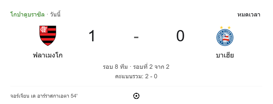 ครึ่งหลัง: ครึ่งหลัง ฟลาเมงโกออกมาเล่นอย่างมั่นใจและทำประตูได้ในนาทีที่ 54 จากการยิงของ Giorgian De Arrascaeta โดยได้รับการแอสซิสต์จาก Bruno Henrique ทำให้ฟลาเมงโกขึ้นนำ 1-0 บาเฮียพยายามเร่งเครื่องเพื่อทำประตูตีเสมอแต่กลับไม่สามารถสร้างโอกาสที่ดีได้ จบเกมด้วยสกอร์ 1-0 ทำให้ฟลาเมงโกเก็บชัยชนะและผ่านเข้าสู่รอบต่อไปได้สำเร็จ