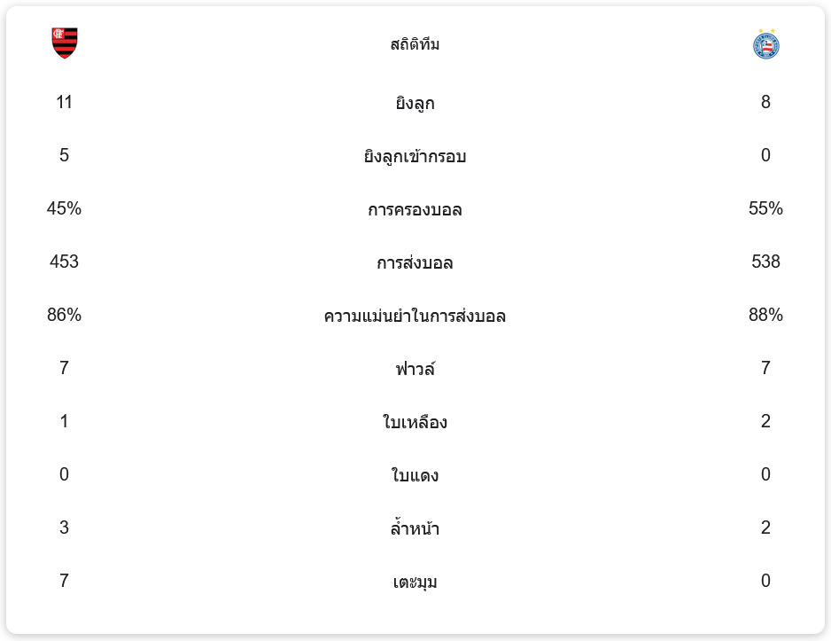 สถิติการแข่งขัน: เกมนี้ ฟลาเมงโกมีการครองบอลอยู่ที่ 45% และยิงทั้งหมด 11 ครั้ง โดยยิงเข้ากรอบ 5 ครั้ง ขณะที่บาเฮียครองบอลมากกว่าเล็กน้อยที่ 55% และมีโอกาสยิงทั้งหมด 8 ครั้ง แต่ไม่มีการยิงเข้ากรอบเลย การส่งบอลของบาเฮียมีความแม่นยำสูงกว่าที่ 88% จากการส่งบอลทั้งหมด 538 ครั้ง ส่วนฟลาเมงโกมีความแม่นยำในการส่งบอลที่ 86% จากการส่งบอล 453 ครั้ง ทั้งสองทีมทำฟาวล์เท่ากันที่ 7 ครั้ง แต่บาเฮียได้รับใบเหลืองมากกว่าถึง 2 ใบ ในขณะที่ฟลาเมงโกได้รับใบเหลืองเพียง 1 ใบ