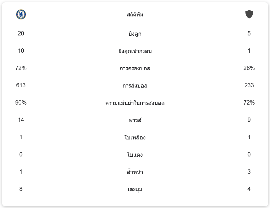 - เชลซีเปลี่ยนตัว คริสโตเฟอร์ เอ็นคุนคู ออกในนาทีที่ 76 และส่ง M. Guiu ลงมาแทน