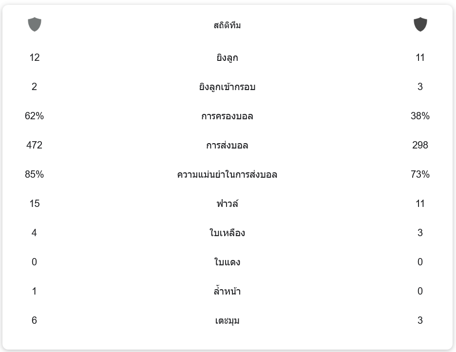 - เอวีเอส ครองบอลได้มากถึง 62% และมีโอกาสยิงถึง 12 ครั้ง แต่สามารถยิงเข้ากรอบได้เพียง 2 ครั้ง ขณะที่ เฟยเรนเซ่ ครองบอลได้น้อยกว่า (38%) แต่สร้างโอกาสยิงได้ใกล้เคียงกัน โดยยิง 11 ครั้งและเข้ากรอบ 3 ครั้ง