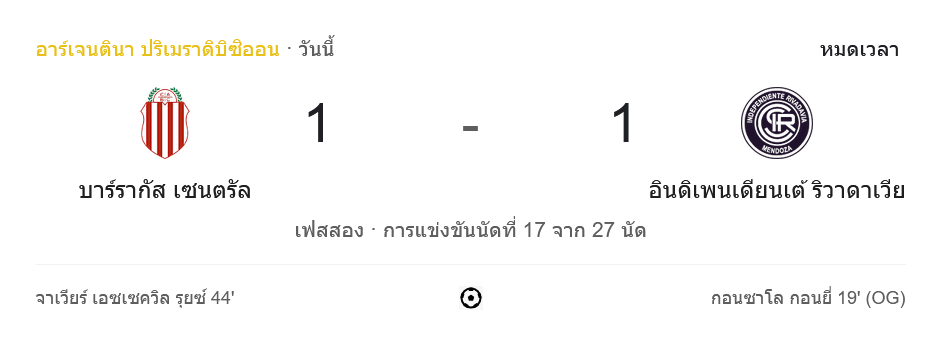 ศึก อาร์เจนตินา ปริเมราดิบิซิออน 2024 นัดที่ 17 ระหว่าง บาร์รากัส เซ็นทรัล และ อินดิเพนเดียนเต้ ริวาดาเวีย ลงสนามไปในค่ำคืนนี้ ผลการแข่งขันจบลงด้วยสกอร์ 1-1 ทำให้ทั้งสองทีมแบ่งแต้มกันไป ในเกมนี้ถือเป็นการดวลที่สนุกดุดัน เต็มไปด้วยความตึงเครียดในทุกจังหวะที่เกิดขึ้น