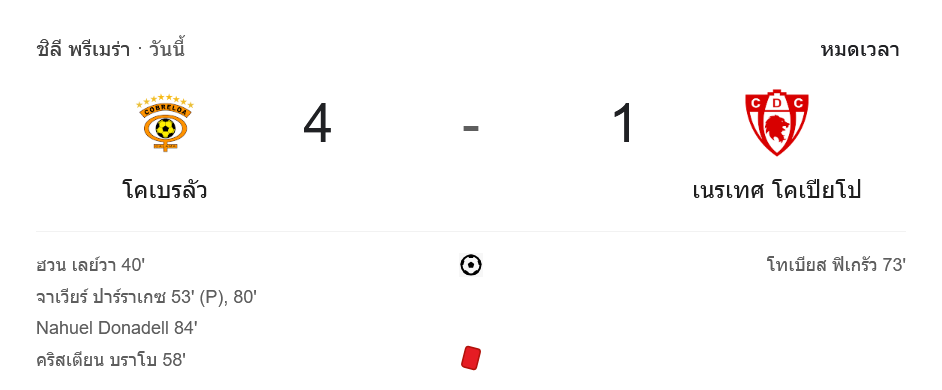 - นาทีที่ 84: นาฮูเอล โดนาเดลล์ ยิงปิดท้ายให้ โคเบรลัว ชนะ 4-1