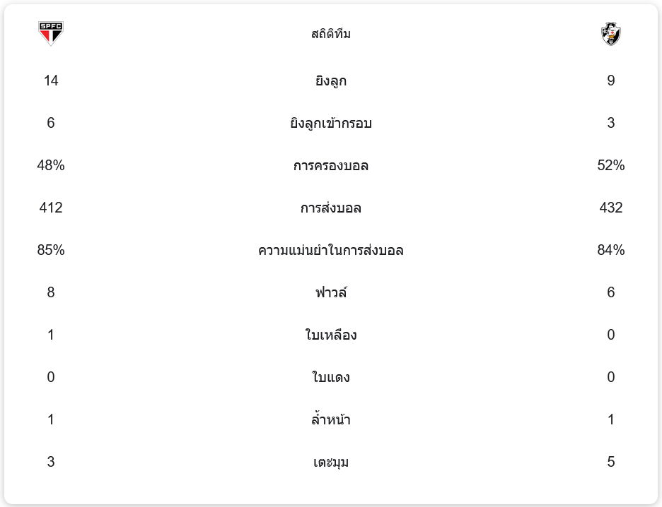 แม้ว่าทีมเยือน วาสโก ดา กามา จะมีการครองบอลมากกว่าที่ 52% และมีการส่งบอลถึง 432 ครั้ง แต่ เซาเปาโล ที่ครองบอล 48% และมีโอกาสยิงถึง 14 ครั้ง กลับสามารถเปลี่ยนเป็น 3 ประตูได้อย่างคมชัด ขณะที่วาสโกยิงได้ 9 ครั้งแต่ไม่สามารถทำประตูได้ ความแม่นยำในการส่งบอลของทั้งสองทีมใกล้เคียงกัน โดยเซาเปาโลมีความแม่นยำ 85% ขณะที่วาสโกอยู่ที่ 84%