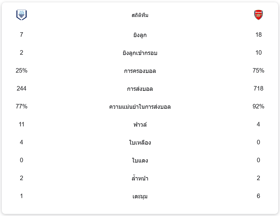 แสดงให้เห็นถึงความเหนือชั้นของอาร์เซนอลที่ครองบอลถึง 75% และมีการส่งบอลสำเร็จถึง 718 ครั้ง เทียบกับเพรสตันที่มีเพียง 244 ครั้ง อาร์เซนอลมีโอกาสยิง 18 ครั้ง เข้ากรอบ 10 ครั้ง ขณะที่เพรสตันได้ยิงเพียง 7 ครั้ง และเข้ากรอบเพียง 2 ครั้ง การส่งบอลของอาร์เซนอลยังมีความแม่นยำสูงถึง 92% ตอกย้ำถึงความเป็นทีมที่มีคุณภาพในทุกด้าน