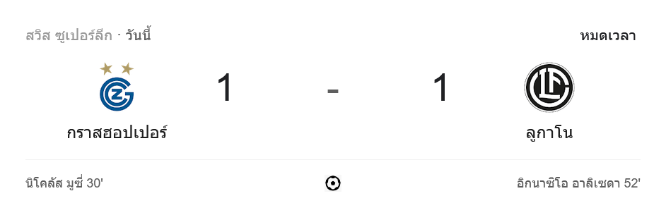เกมการแข่งขัน สวิสซูเปอร์ลีก 2024 ระหว่าง กราสฮ็อปเปอร์ และ ลูกาโน จบลงด้วยผลเสมอ 1-1 โดยทั้งสองทีมสู้กันอย่างดุดัน กราสฮ็อปเปอร์ได้ประตูนำก่อนจากการยิงของ นิโคลัส มูชี่ ในนาทีที่ 30 ก่อนที่ลูกาโนจะตามตีเสมอได้ในครึ่งหลังจาก อิกนาซิโอ อลิเซดา นาทีที่ 52 แม้ว่าทั้งสองฝ่ายพยายามสร้างโอกาสเพิ่มเติม แต่ไม่สามารถทำประตูเพิ่มได้ จบเกมแบ่งแต้มกันไปอย่างสมศักดิ์ศรี
