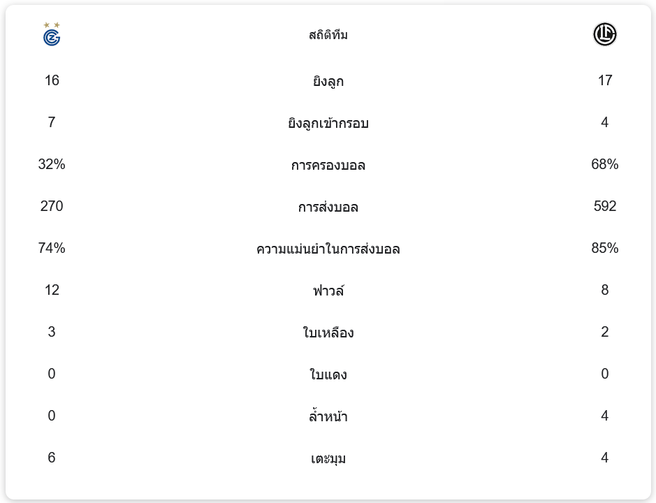 - 🟨 นาทีที่ 17 – ดี ดา สิลวา คอร์เรีย ของกราสฮ็อปเปอร์รับใบเหลือง