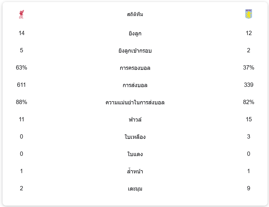 ลิเวอร์พูลครองบอลถึง 63% และมีการส่งบอล 611 ครั้งด้วยความแม่นยำถึง 88% เมื่อเทียบกับแอสตัน วิลล่าที่ครองบอลเพียง 37% และมีโอกาสยิง 12 ครั้ง แต่เข้ากรอบแค่ 2 ครั้งเท่านั้น