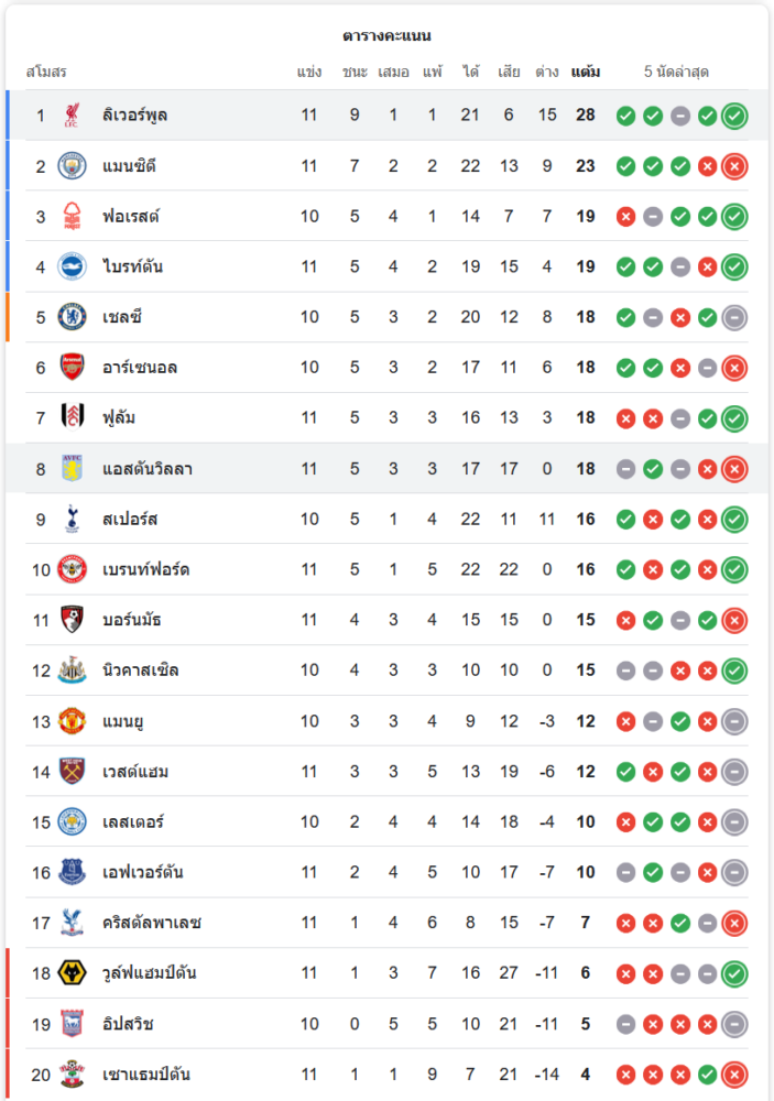 หลังจากเก็บชัยชนะในนัดนี้ ลิเวอร์พูลยังคงรักษาตำแหน่งจ่าฝูงต่อไป โดยมี 28 คะแนนจากการลงเล่น 11 นัด ซึ่งห่างจาก แมนเชสเตอร์ ซิตี้ ที่อยู่อันดับสองถึง 5 คะแนน ทำให้โอกาสคว้าแชมป์ฤดูกาลนี้เริ่มมองเห็นได้ชัดเจนขึ้น