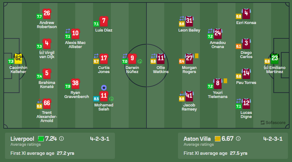 ลิเวอร์พูลมาในแผน 4-2-3-1 ที่เน้นความคล่องตัวในแดนหน้า โดย โมฮาเหม็ด ซาลาห์ และ ดาร์วิน นูเญซ ร่วมกันสร้างเกมบุกที่ดุดัน ส่วนแอสตัน วิลล่าใช้แผน 4-2-3-1 เช่นกัน แต่ไม่สามารถป้องกันการบุกที่แข็งแกร่งของลิเวอร์พูลได้