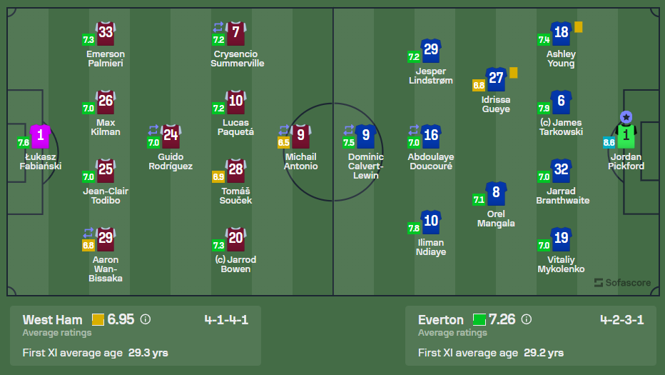 เวสต์แฮมมาในแผน 4-1-4-1 โดยมีการส่ง จาร์รอด โบเว่น เป็นกัปตันเพื่อควบคุมจังหวะในแดนกลาง ขณะที่เอฟเวอร์ตันใช้แผน 4-2-3-1 โดยมี จอร์แดน พิคฟอร์ด ผู้รักษาประตูเป็นศูนย์กลางของการเล่นรับที่แข็งแกร่ง ทำให้การโจมตีของเวสต์แฮมถูกจำกัดอย่างมาก