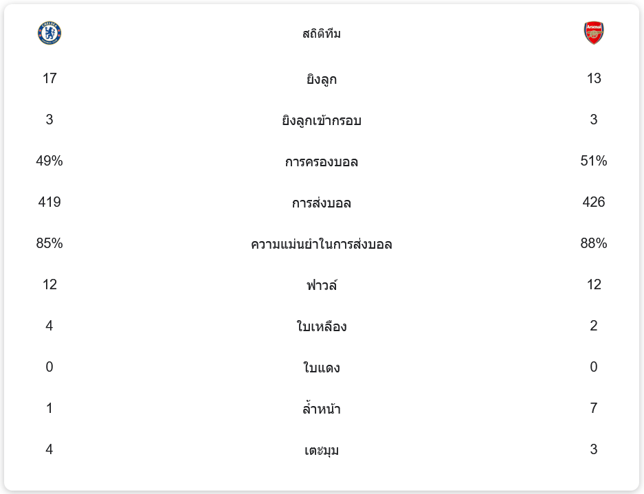 เชลซีครองบอล 49% ขณะที่อาร์เซนอลครองบอล 51% ทั้งสองทีมมีโอกาสยิงรวมกัน 30 ครั้ง โดยเชลซีมี 17 ครั้ง และอาร์เซนอล 13 ครั้ง เกมนี้มีการฟาวล์รวมกันถึง 24 ครั้ง และใบเหลืองถึง 6 ใบ นับว่าเป็นเกมที่มีความเข้มข้นและการปะทะดุเดือดตลอดทั้งเกม