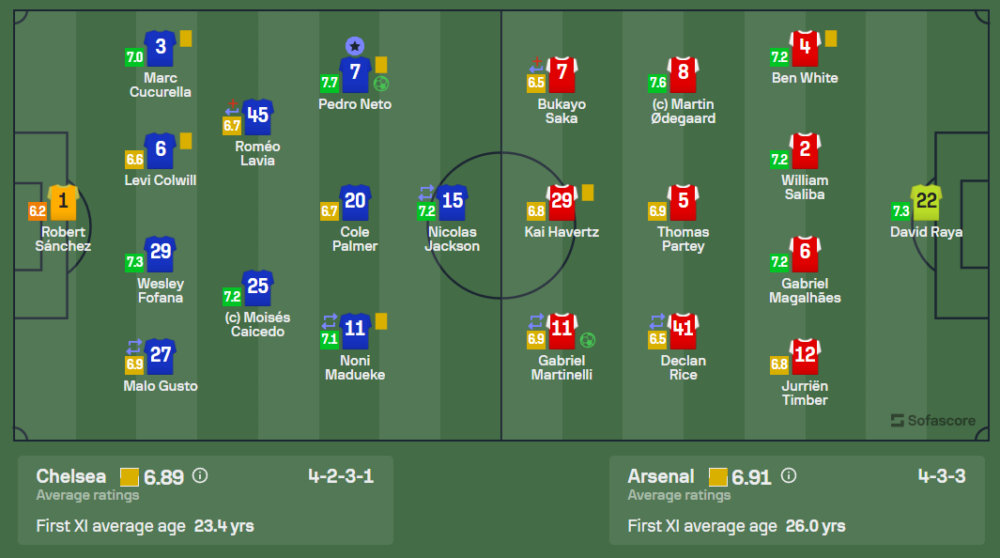ผู้เล่นตัวจริง: โรเบิร์ต ซานเชซ, มาร์ก กูกูเรย่า, เวสลีย์ โฟฟาน่า, ลีวาย โคลวิลล์, มาโล กุสโต้, โรเมโอ ลาเวีย, เอ็นโซ เฟร์นานเดซ, เปโดร เนโต, โคล พาลเมอร์, นอนี่ มาดูเอเก้, นิโคลัส แจ็คสัน