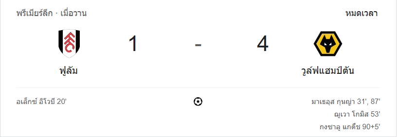 เกมนี้แสดงให้เห็นถึงความแข็งแกร่งของวูล์ฟแฮมป์ตันที่สามารถเอาชนะฟูแล่มได้อย่างยอดเยี่ยม ด้วยฟอร์มการเล่นที่เหนือกว่าในทุกด้าน ขณะที่ฟูแล่มเองยังต้องปรับแผนเกมรับเพื่อยืนหยัดในลีกนี้ให้ได้ สำหรับแฟนบอลที่ต้องการติดตาม ผลบอลสด และข่าวสารเกี่ยวกับพรีเมียร์ลีก อย่าลืมติดตาม บ้านกีฬา ที่อัปเดตให้คุณแบบเรียลไทม์