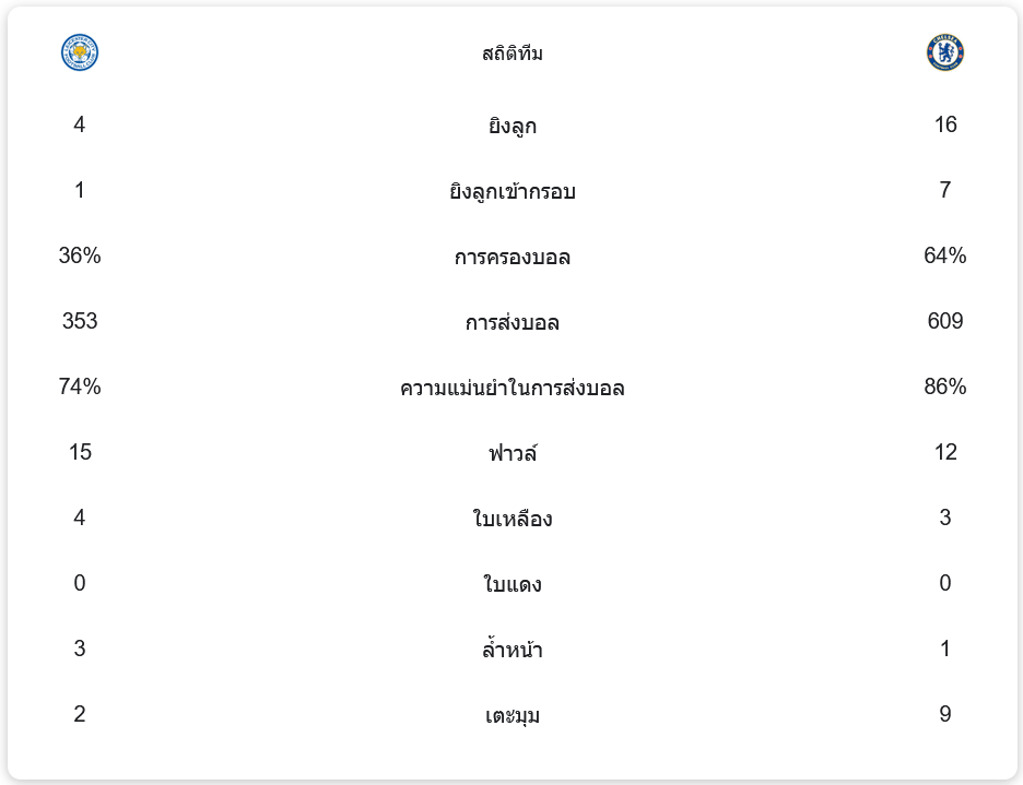 เชลซีครองบอลเหนือกว่าอย่างชัดเจน ยิงทั้งหมด 16 ครั้ง เข้ากรอบ 7 ครั้ง ขณะที่เลสเตอร์มีโอกาสยิงเพียง 4 ครั้งและเข้ากรอบแค่ 1 ครั้ง ความแม่นยำในการส่งบอลของเชลซีอยู่ที่ 86% เทียบกับเลสเตอร์ที่ทำได้เพียง 74%