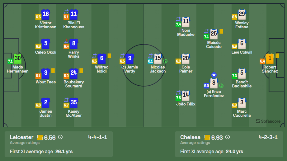 เชลซีใช้แผน 4-2-3-1 โดยเน้นการครองบอลถึง 64% เกมรุกผ่านแดนกลางที่นำโดย เอ็นโซ่ เฟร์นานเดซ ที่สร้างโอกาสได้อย่างชาญฉลาด ส่วนเลสเตอร์เน้นแผน 4-4-1-1 ซึ่งมุ่งหวังเกมสวนกลับ แต่ถูกตัดเกมกลางสนามจนสร้างโอกาสได้น้อย