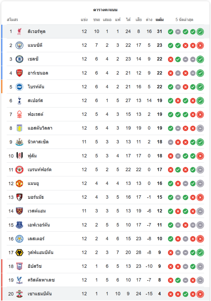 ลิเวอร์พูลยังคงยืนหนึ่งในตารางพรีเมียร์ลีก ด้วยคะแนน 31 แต้มจาก 12 นัด ขณะที่เซาแธมป์ตันยังจมอยู่ท้ายตาราง มีเพียง 4 แต้มจาก 12 นัด