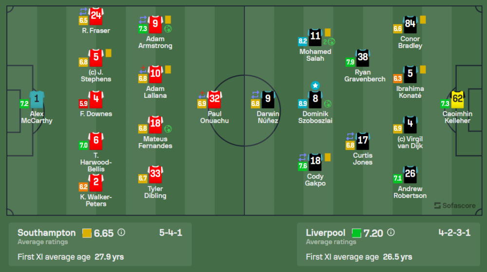 ในช่วง 30 นาทีแรก ลิเวอร์พูลบุกหนักจนกระทั่งนาทีที่ 30 โดมินิก โซบอสซ์ไล ยิงประตูสุดเฉียบคมให้ทีมเยือนขึ้นนำ 1-0 แต่ในนาทีที่ 42 อดัม อาร์มสตรอง ของเซาแธมป์ตันไม่ยอมง่าย ๆ ตีเสมอ 1-1 ก่อนจบครึ่งแรกอย่างดุเดือด