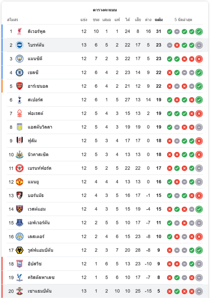 ไบรท์ตันรั้งอันดับ 2 มี 23 คะแนน ส่วนเซาแธมป์ตันยังจมอันดับสุดท้าย มีเพียง 5 คะแนนจาก 13 นัด