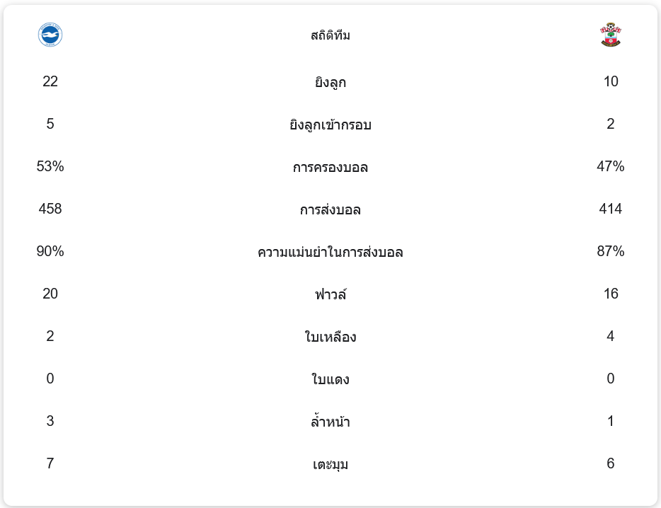 - ไบรท์ตัน: ยิง 22 ครั้ง, เข้ากรอบ 5 ครั้ง, ครองบอล 53%, การจ่ายบอลแม่นยำ 90%