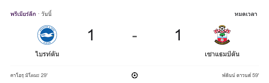 จาก : ผลบอลสด พรีเมียร์ลีก 2024 ระหว่าง ไบรท์ตัน โฮฟ อัลเบี้ยน 1-1 เซาแธมป์ตัน วันนี้ 30/11/67 – บ้านกีฬา