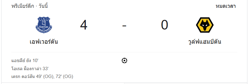 บ้านกีฬา รายงานผลบอลสดจากสนามกูดิสันพาร์ค เอฟเวอร์ตันเปิดบ้านถล่มวูล์ฟแฮมป์ตัน 4-0 โดยมีสองประตูที่เป็นการทำเข้าประตูตัวเองจากฝั่งวูล์ฟส์ พร้อมกับประตูที่ยอดเยี่ยมของแอชลีย์ ยัง และโอเรล มานกาลา พาทีมเก็บชัยชนะขาดลอย