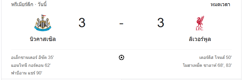 นาทีที่ 90+6: ผู้ตัดสินเป่าหมดเวลา นิวคาสเซิ่ล ยูไนเต็ดเสมอลิเวอร์พูล 3-3