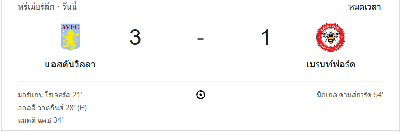 นาทีที่ 90+4: ผู้ตัดสินเป่าหมดเวลา แอสตัน วิลล่าเอาชนะเบรนท์ฟอร์ด 3-1