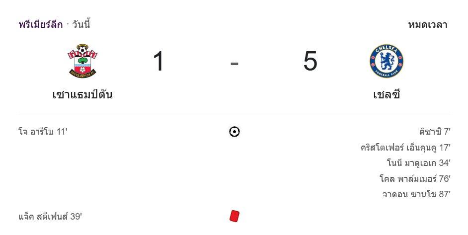 จาก : ผลบอลสด พรีเมียร์ลีก 2024 ระหว่าง เซาแธมป์ตัน 1-5 เชลซี วันนี้ 05/12/67 – บ้านกีฬา