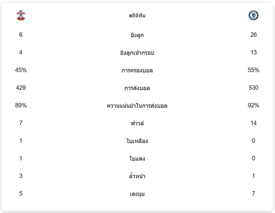 เชลซีครองบอลถึง 55% และมีโอกาสยิงถึง 26 ครั้ง โดยเข้ากรอบ 13 ครั้ง ขณะที่เซาแธมป์ตันมีโอกาสยิงเพียง 6 ครั้ง แต่เข้ากรอบถึง 4 ครั้ง ความแม่นยำในการส่งบอลของเชลซีสูงถึง 92% แสดงถึงการประสานงานที่ยอดเยี่ยมของทีม