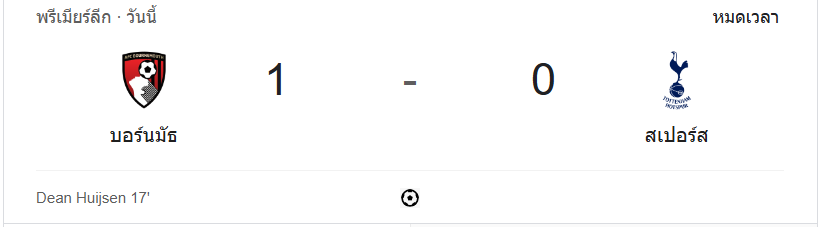 ศึกพรีเมียร์ลีกค่ำคืนที่ผ่านมาทำให้แฟนบอลต้องจับตากันอย่างใกล้ชิด เมื่อบอร์นมัธเปิดบ้านต้อนรับท็อตแน่ม ฮ็อทสเปอร์ และด้วยผลงานอันยอดเยี่ยมของดีน ฮุยเซ่นที่ทำประตูชัยตั้งแต่นาทีที่ 17 บอร์นมัธสามารถยืนหยัดรักษาสกอร์ไว้ได้จนจบเกม พร้อมเก็บสามแต้มสำคัญได้สำเร็จ ติดตาม ผลบอลสด และเหตุการณ์สำคัญจากเกมนี้ที่บ้านกีฬา!