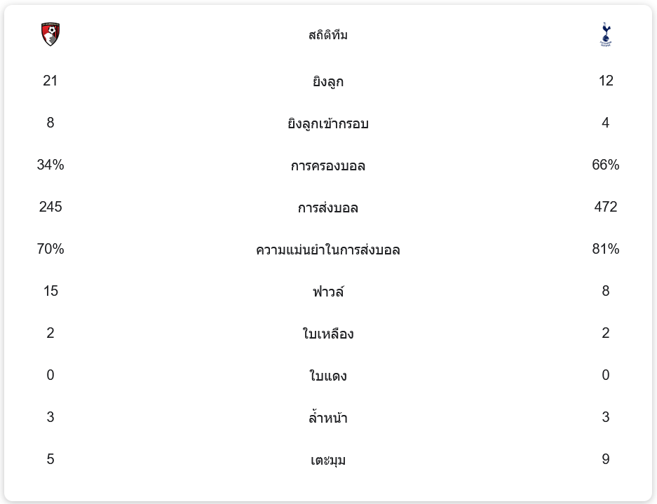 - การครองบอล: บอร์นมัธ 34% – 66% สเปอร์ส