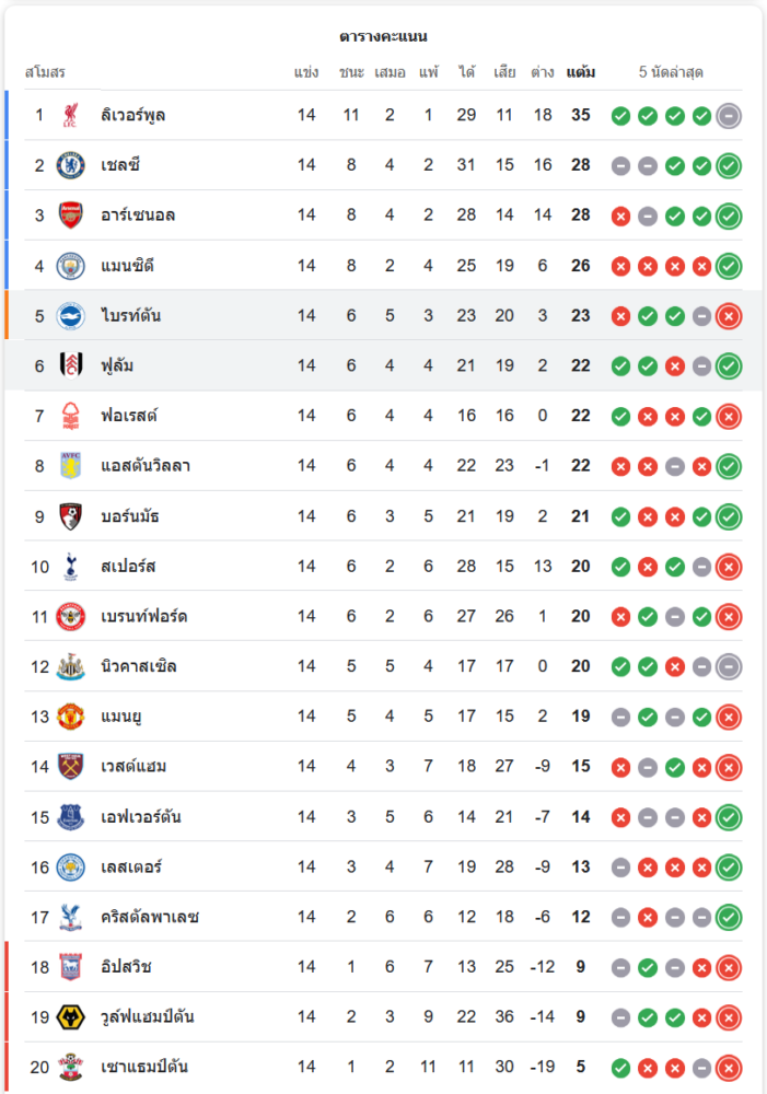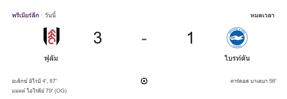 ชัยชนะในเกมนี้ช่วยให้ ฟูแล่ม เก็บเพิ่มเป็น 22 คะแนนจาก 14 นัด ขึ้นอันดับ 6 ส่วน ไบรท์ตัน ยังคงอยู่ที่ 5 มี 23 คะแนน ต้องกลับมาพัฒนาฟอร์มอย่างเร่งด่วน