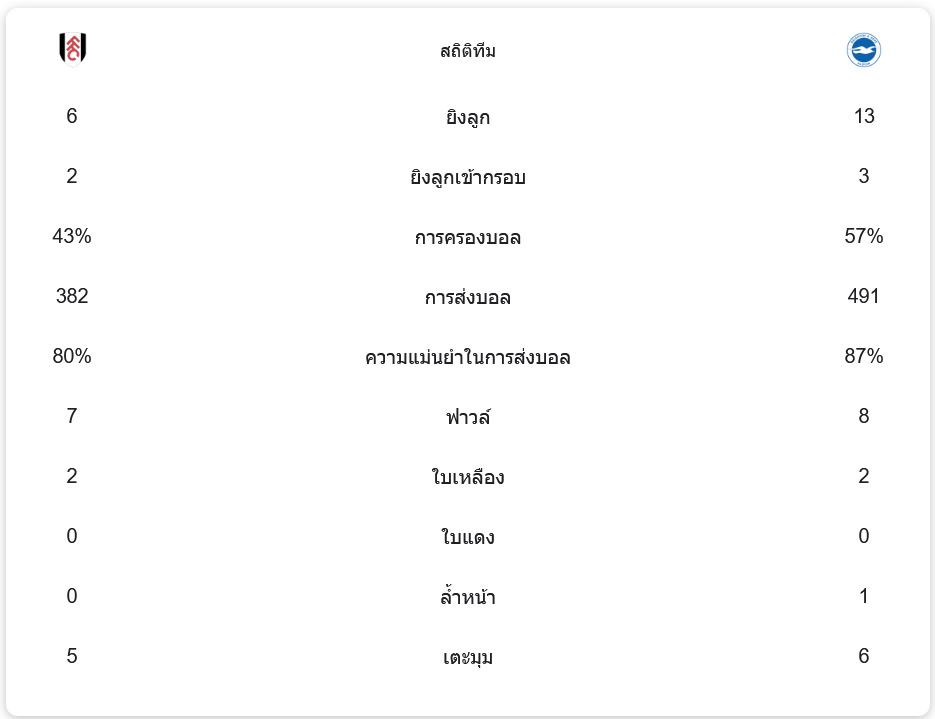 เกมนี้ ฟูแล่ม แม้จะครองบอลน้อยกว่า (43%) แต่กลับมีประสิทธิภาพในการจบสกอร์ ขณะที่ ไบรท์ตัน ยิงมากกว่า (13 ครั้ง) แต่เข้ากรอบเพียง 3 ครั้งเท่านั้น ฟูแล่มยังโดดเด่นในด้านเกมรับที่ป้องกันลูกตั้งเตะได้อย่างแข็งแกร่ง